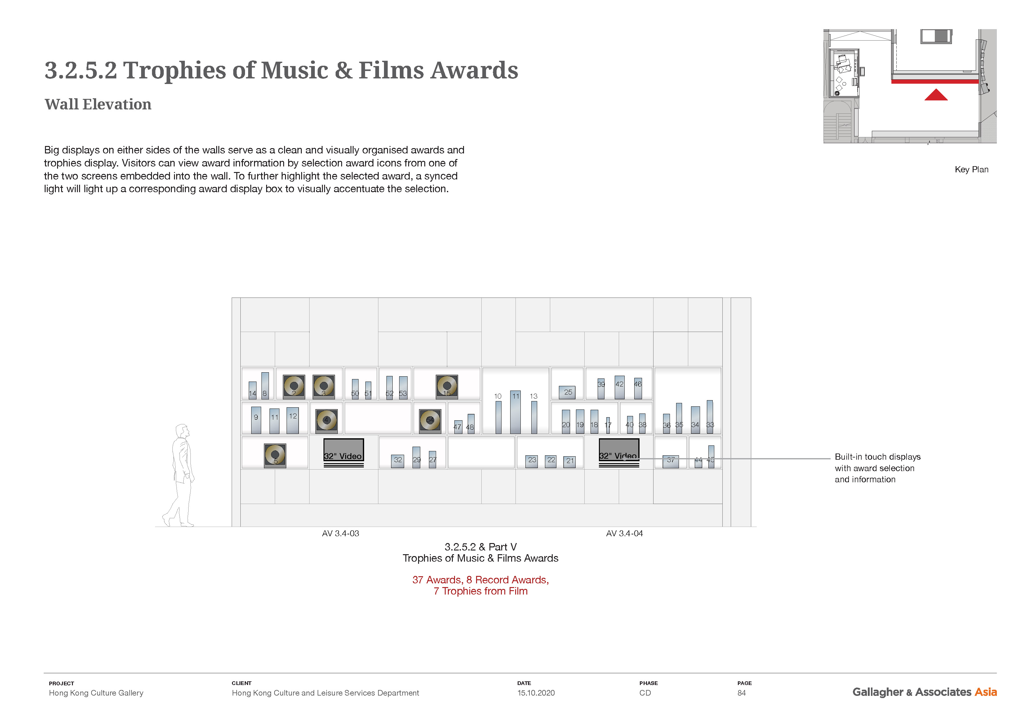 The main feature of this gallery is the 360° concert stage where it displays costumes worn by Hong Kong’s most notable performers. Above the stage is a suspended circular LED screen that displays clips from famous concerts which along with theatrical lighting effects will become a centrepiece to the gallery. It sets the scene for celebration and exploration of canto pop music through multiple decades. The permeter full height showcases display most popular music albums in the last 3 decades and glass showcases display guitars and accessories worn by famous artists.